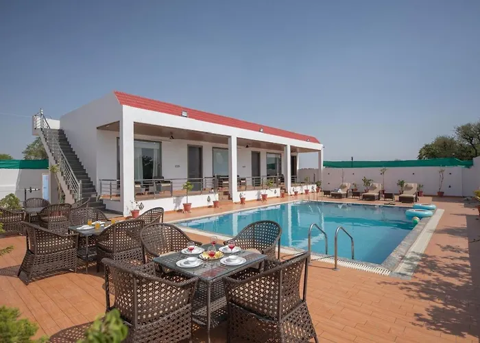 Villa Farm Retreat à Jaipur dispose d'une terrasse avec vue sur la piscine, ainsi que d'une piscine privée.